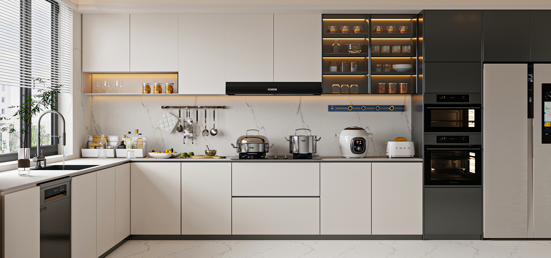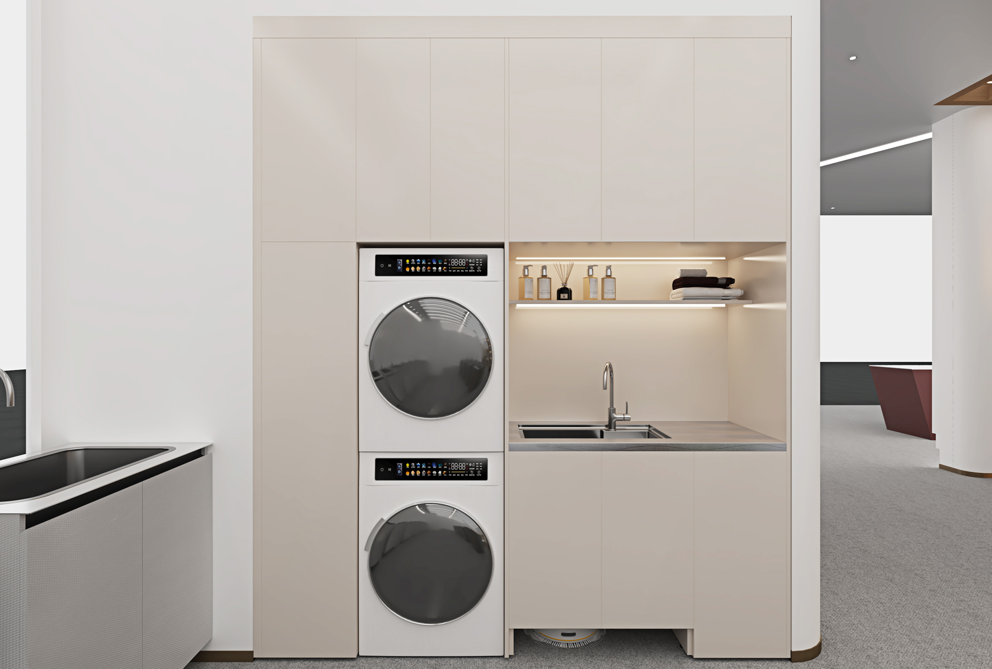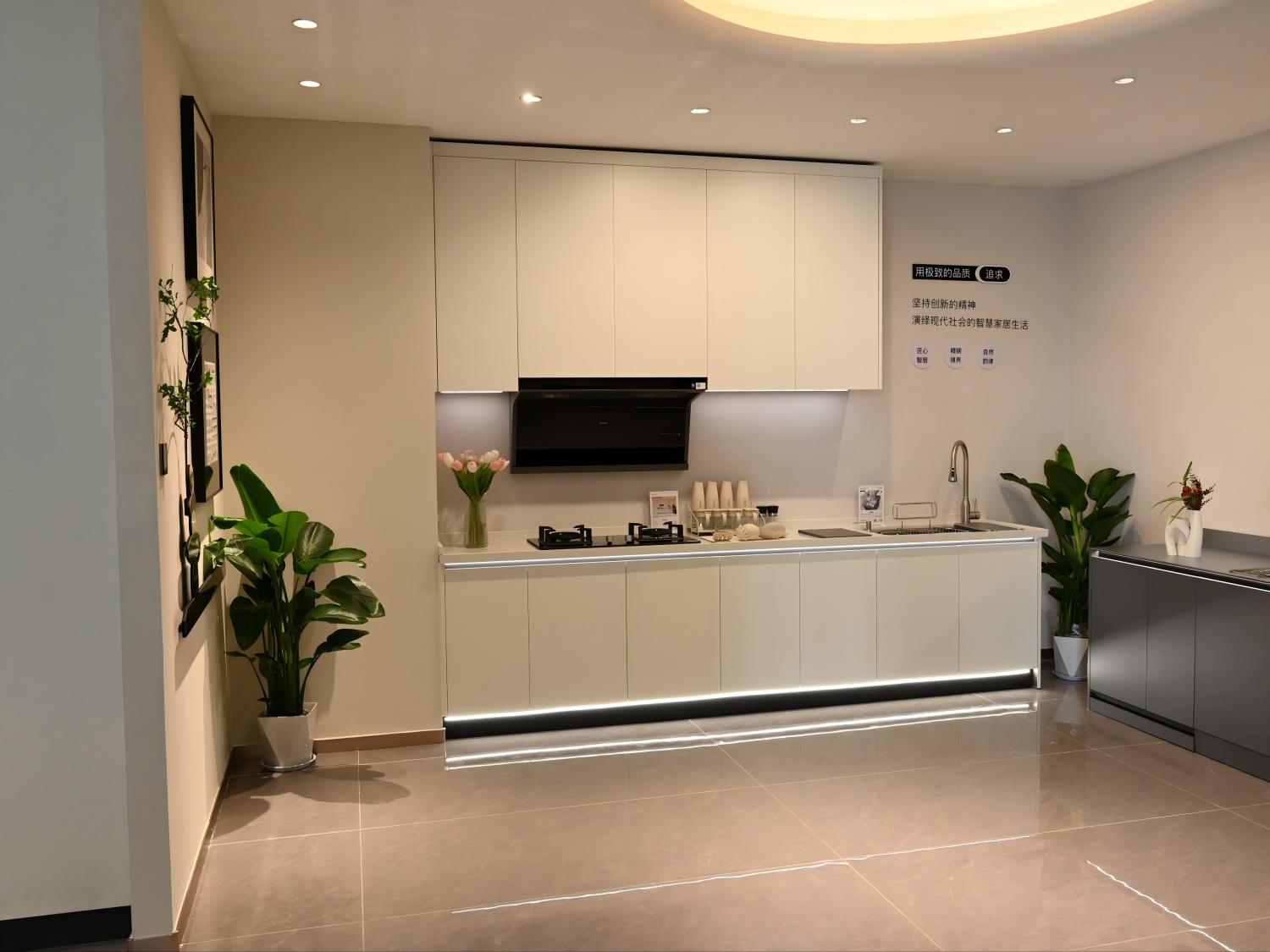 工艺:柜体采用米提白、奶油白的纯色烤漆不锈钢;内部蜂窝铝夹层;水槽做台下盆设计;嵌入式灯条