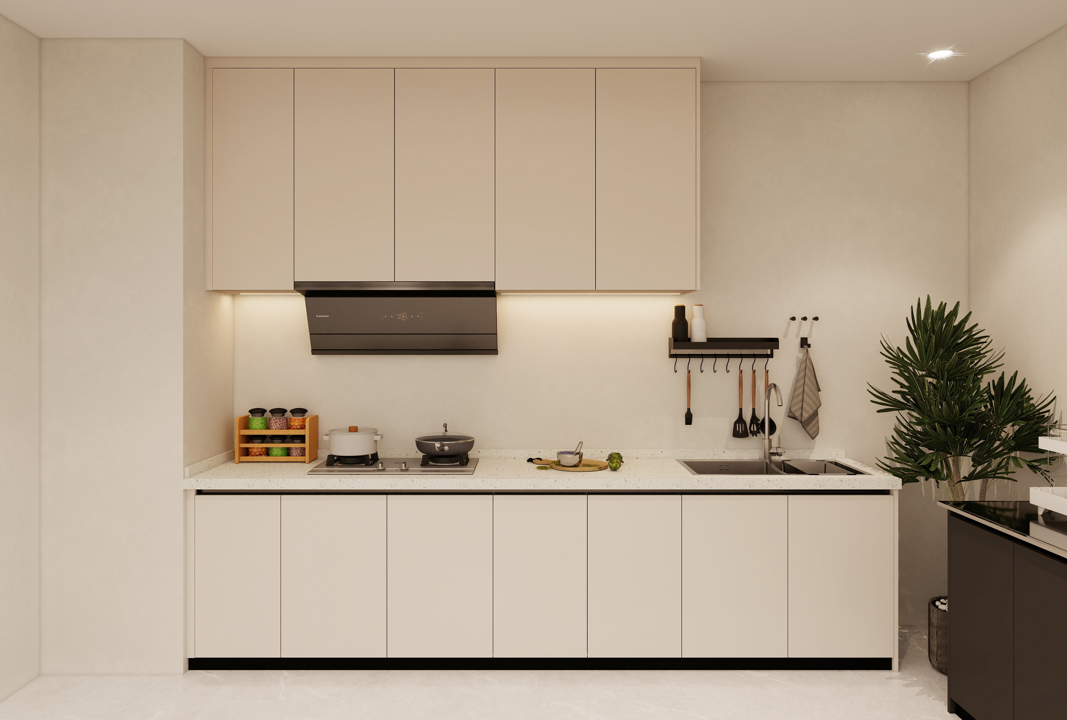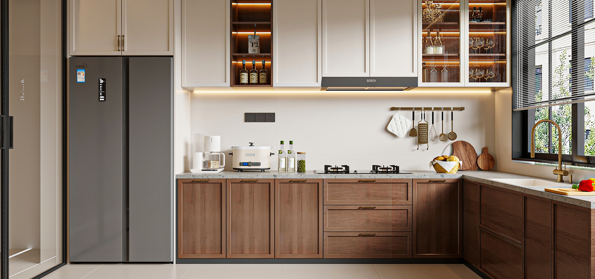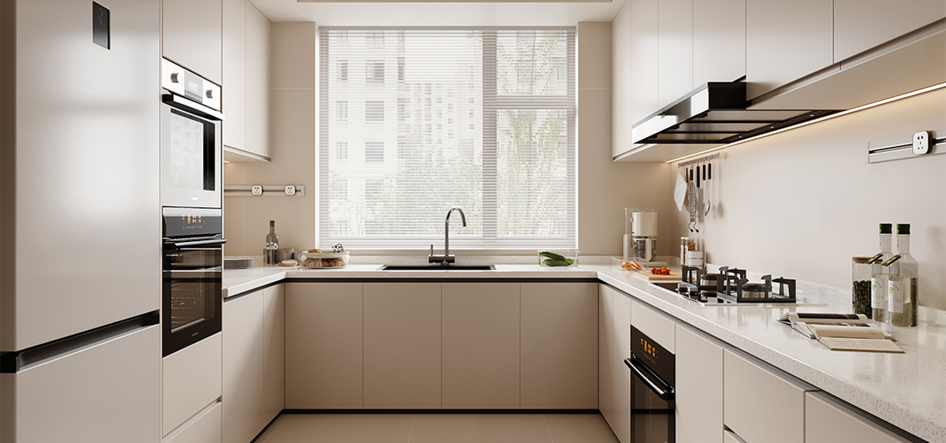 工艺:柜体采用米提白、奶油白的纯色烤漆不锈钢;内部蜂窝铝夹层;水槽做台下盆设计;嵌入式灯条