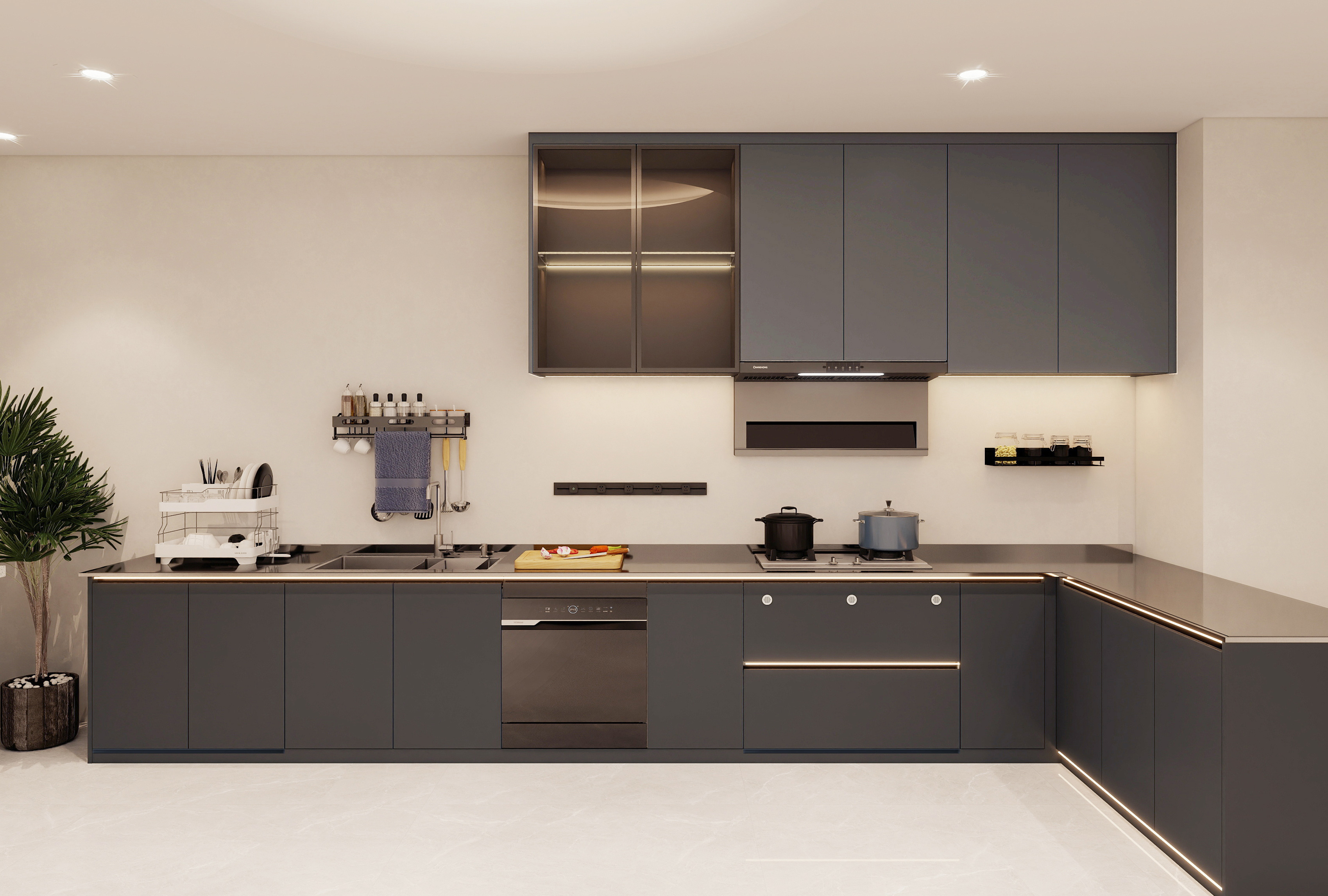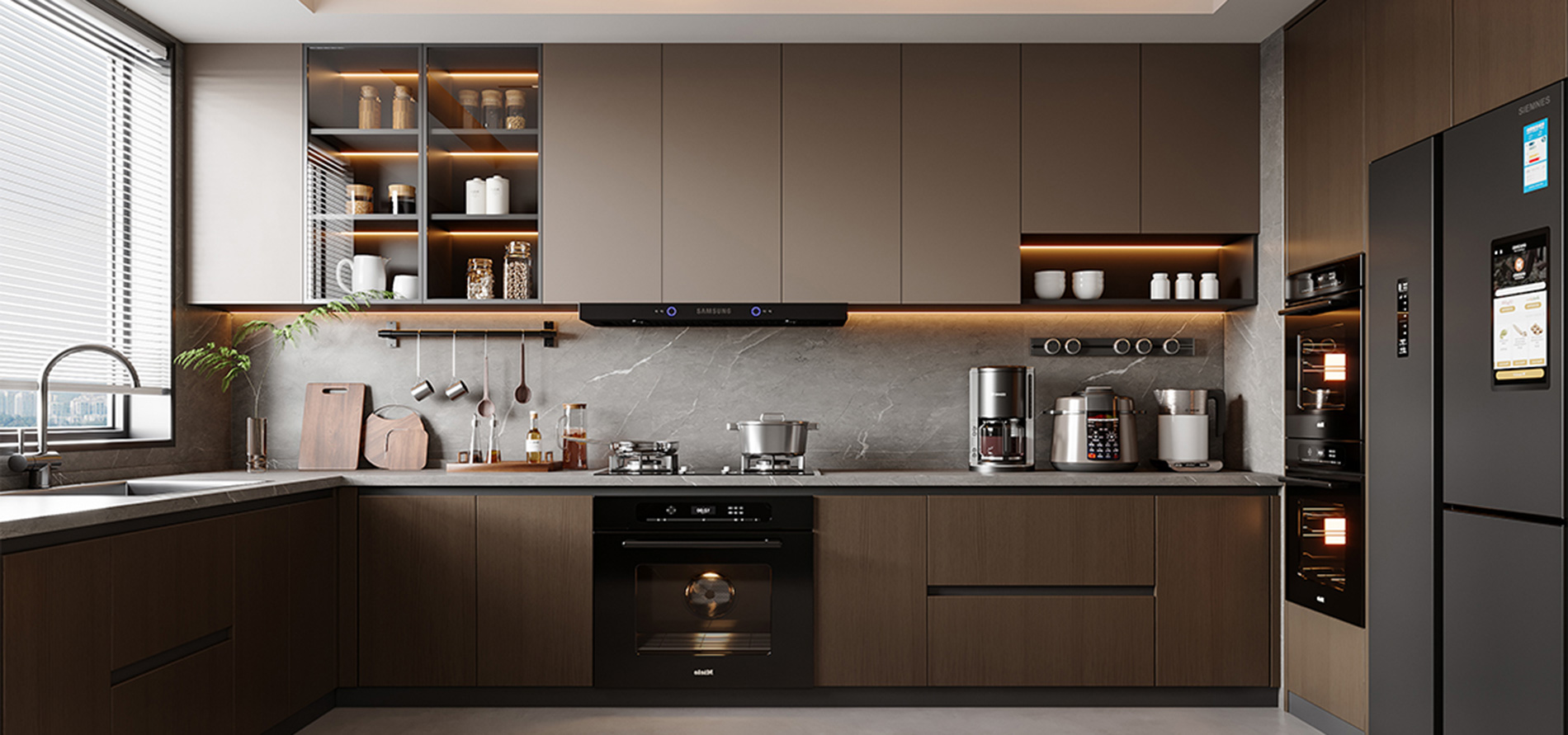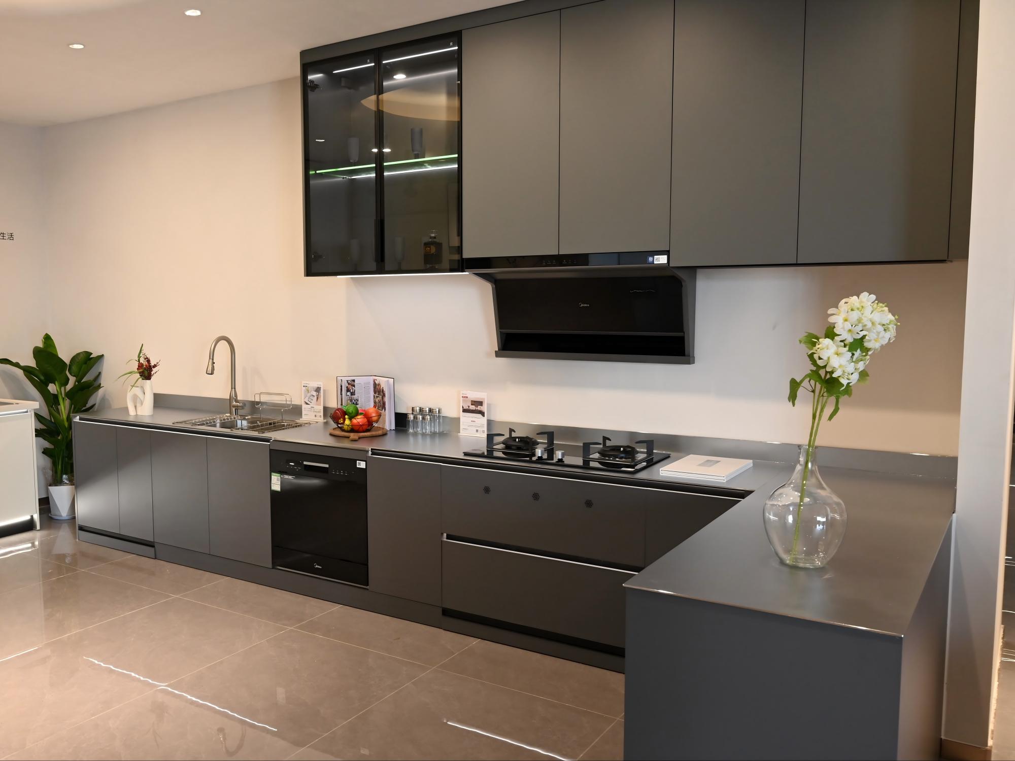 工艺:柜体采用高级灰、子午灰的纯色烤漆不锈钢;多元空间拉篮系统;高级钢化灰玻吊柜柜门;嵌门式垃圾桶设计;L型转角烹饪空间;焊接一体盆