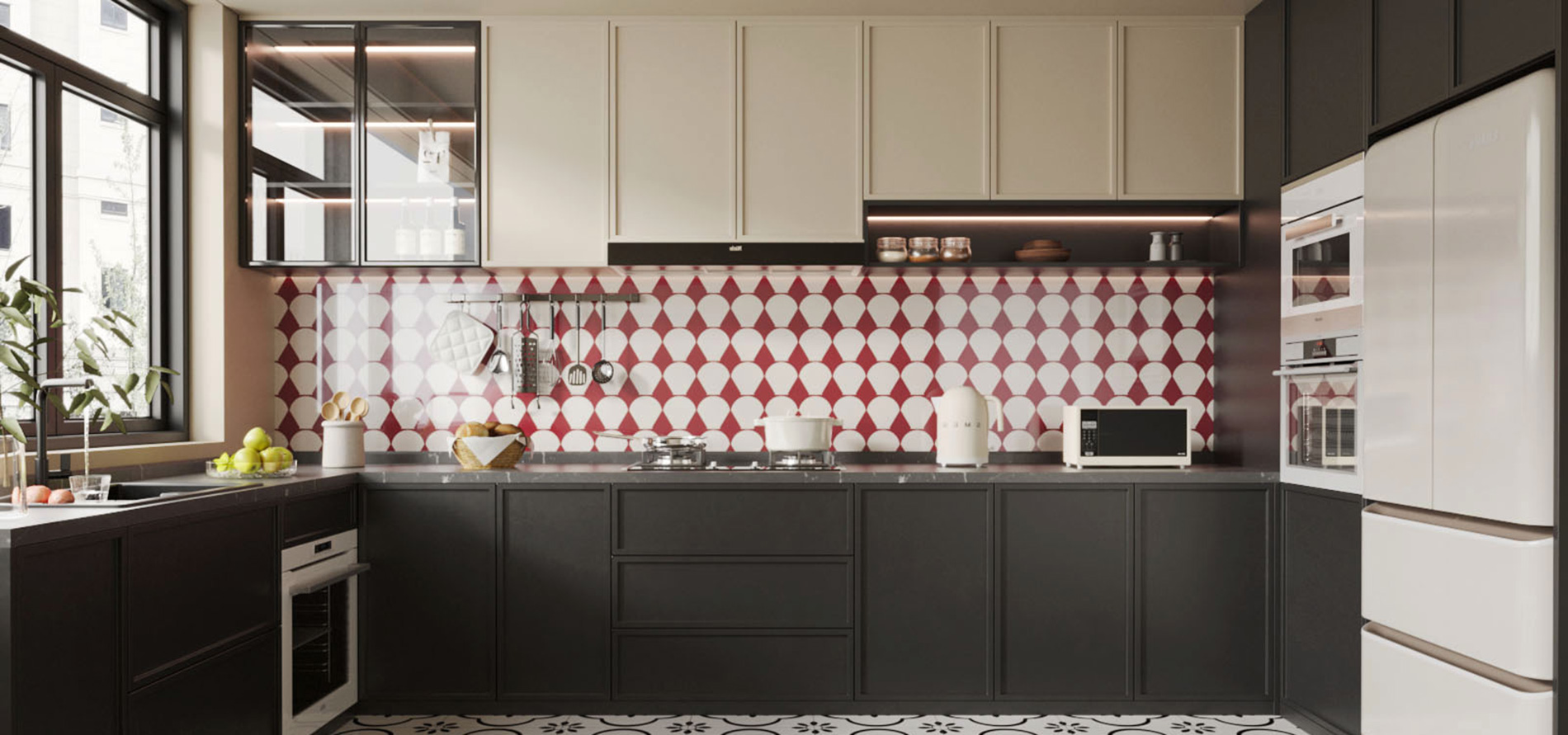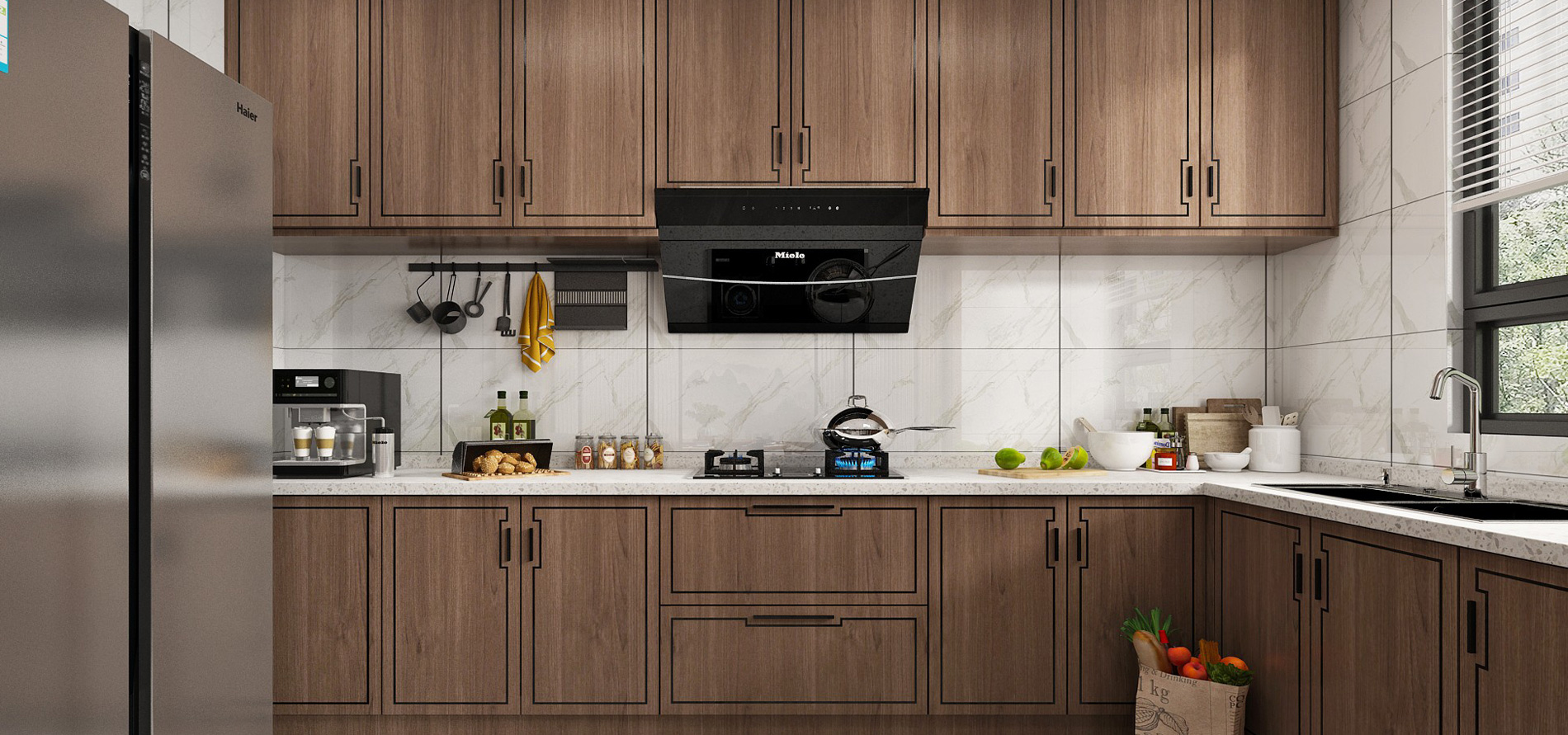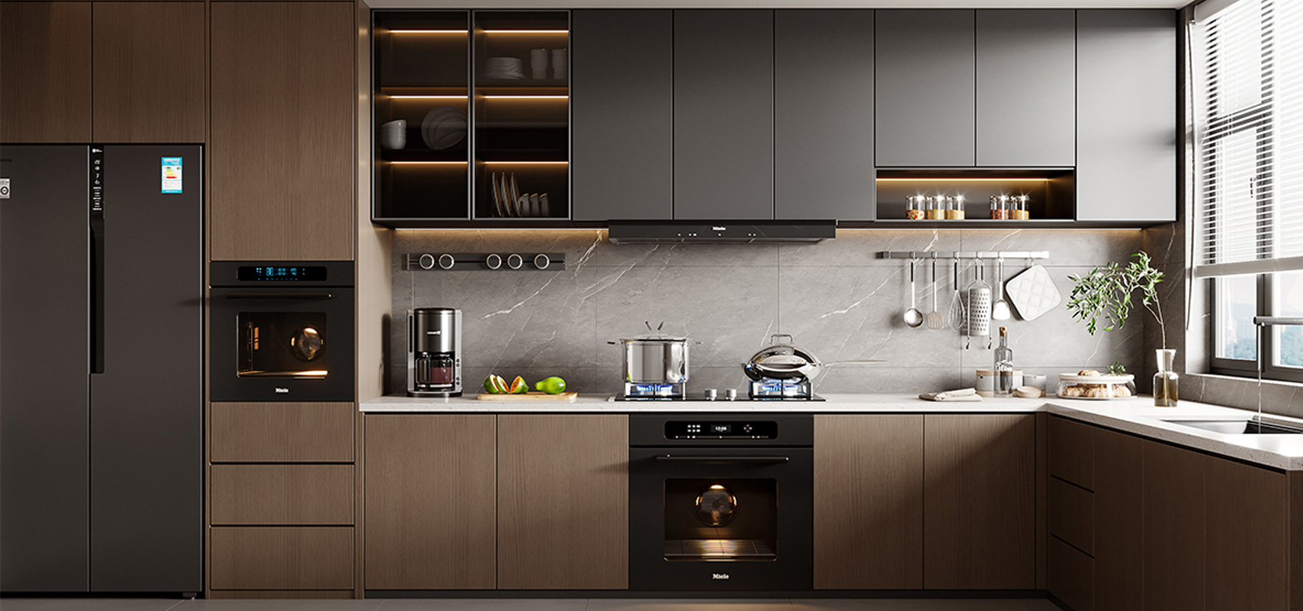 工艺:柜体采用高级灰、子午灰的纯色烤漆不锈钢;多元空间拉篮系统;高级钢化灰玻吊柜柜门;嵌门式垃圾桶设计;L型转角烹饪空间;焊接一体盆