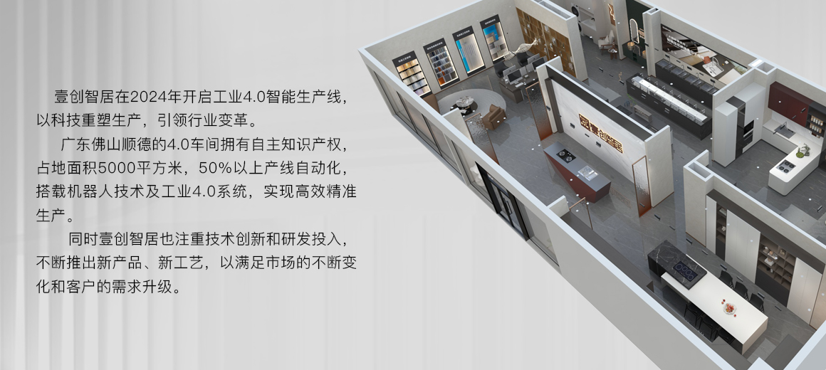 壹创智居在2024年开启工业4.0智能生产线,以科技重塑生产,引领行业变革。 广东佛山顺德的4.0车间拥有自主知识产权,占地面积5000平方米,50%以上产线⾃动化,搭载机器⼈技术及⼯业4.0系统,实现⾼效精准⽣产。 同时壹创智居也注重技术创新和研发投⼊,不断推出新产品、新⼯艺,以满⾜市场的不断变化和客户的需求升级。